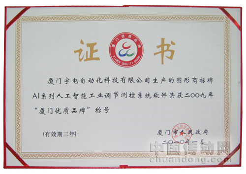 “宇電圖形商標牌AI系列人工智能工業調節測控系統軟件”被評為“2009年度廈門優質品牌”。此活動是由廈門市人民政府根據《廈門優質品牌管理辦法》相關規定,經廈門市發展品牌經濟領導小組審定并公示,同意授予由廈門宇電科技有限有公司生產的宇電商標牌AI系列人工智能工業調節測控系統軟件為2009年“廈門優質品牌”稱號。