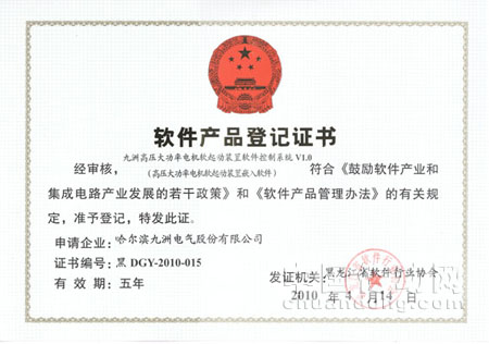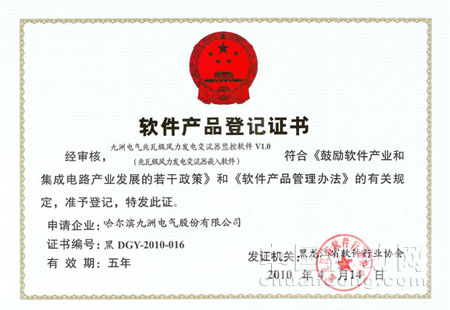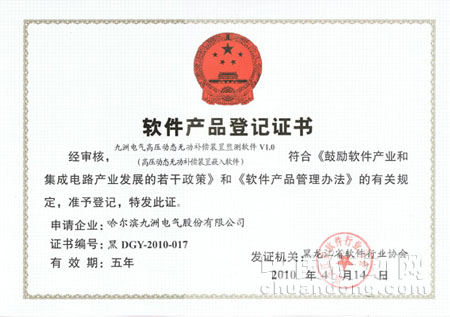 近日,哈爾濱九洲電氣股份有限公司自主研發的“兆瓦級風力發電變流器嵌入軟件”、“高壓動態無功補償裝置嵌入軟件”及“高壓大功率電機軟起動裝置嵌入軟件”順利通過省工信委相關部門的評測及審核,符合《鼓勵軟件產業和集成電路產業發展的若干政策》和《軟件產品管理辦法》的有關規定,準予登記,并獲得了黑龍江省軟件行業協會授予的軟件產品登記證書。