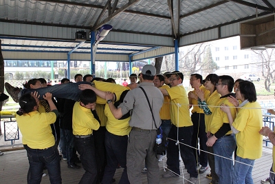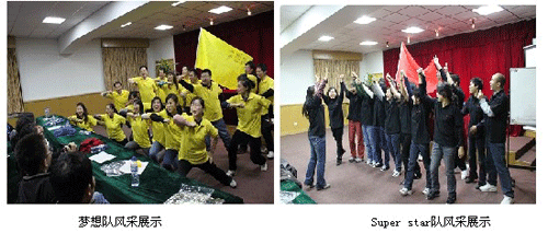 訓練伊始,劉教練為參訓隊員下達了“解職令”,告誡大家忘記自己在工作中的身份職位,所有參訓人員均是訓練營中的成員。分組后的短短數十分鐘內,各小組成員集思廣益迅速確定了隊長、隊名、隊標、隊歌,通過“我型我秀”的方式進行展示,最終確定了“夢想隊”和“Super star隊”兩個小組。訓練場上“夢想隊”和“Super star隊”的角逐、組內的競爭與合作、全體參訓隊員的通力合作、個人的自我挑戰等等,都上演了“成功”與“失敗”。