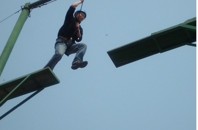 高空斷橋——戰勝自我最關鍵。斷橋距離地面8.5米高,橋的斷口從1.2米到1.8米(可隨意調節)。每一位隊員都要從立柱爬上斷橋,然后學員借助安全帶、主繩及鋼索保護,在培訓師的輔助下從橋的一端跳躍到橋的另一端,然后,再跳躍回來。
