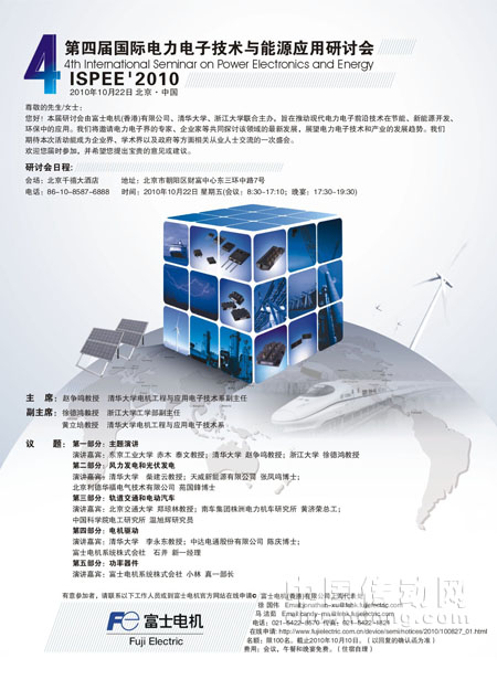 您好!本屆研討會由富士電機(香港)有限公司、清華大學、浙江大學聯(lián)合主辦,旨在推動現(xiàn)代電力電子前沿技術(shù)在節(jié)能、新能源開發(fā)、環(huán)保中的應(yīng)用。我們將邀請電力電子界的專家、企業(yè)家等共同探討該領(lǐng)域的最新發(fā)展,展望電力電子技術(shù)和產(chǎn)業(yè)的發(fā)展趨勢。我們期待本次活動能成為企業(yè)界、學術(shù)界以及政府等方面相關(guān)從業(yè)人士交流的一次盛會。歡迎您屆時參加,并希望您提出寶貴的意見或建議。