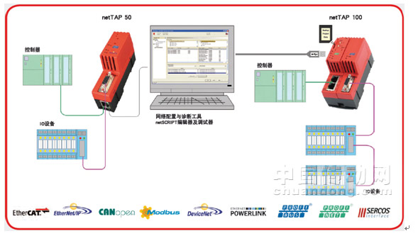 2、NT100——通用協議自由轉換網關,保證工廠系統穩定通訊,消除不同通訊協議設備連接的障礙,不管是對于Profibus、CANopen、Devicenet、CC-Link等現場總線,還是PROFINET、EtherCAT、Ethernet/IP、SERCOS III、PowerLink、Modbus/TCP等實時以太網,或者Modbus RTU、ASCII、netSCRIPT(自定義串口協議)等串口協議,NT100對各種工業網絡互連都提供了解決方案。