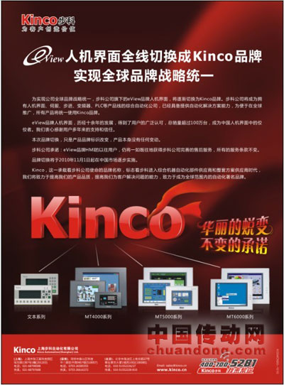 為實現公司全球品牌戰略統一,步科公司旗下的eView品牌人機界面,將逐漸切換為Kinco品牌。步科公司將成為擁有人機界面、伺服、步進、變頻器、PLC等產品線的綜合自動化公司,已經具備提供自動化解決方案能力,為便于在全球推廣,所有產品將統一使用Kinco品牌。
