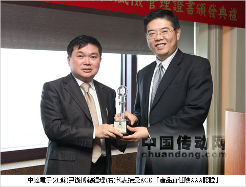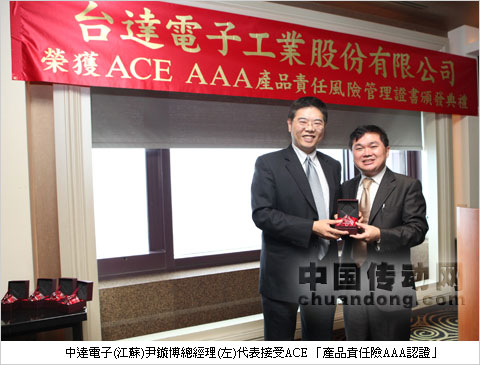 臺達電子3日獲全球最具公信力的稽核認證系統--美商安達產物保險公司(ACE)「產品責任風險管理AAA」認證,為亞太地區電子業唯一連續獲得此項國際級認證之企業。臺達連續叁年在「產品責任風險管理AAA」評鑑的11項指標均獲得AAA滿分肯定,顯示臺達在經營者責任風險管理、產品設計及製造、品質保證、產品安全、內部稽核等指標達到世界級最高標準。繼2008年臺達電子(東莞)、2009年泰達電子,2010年中達電子(江蘇)獲得此項認證的肯定。