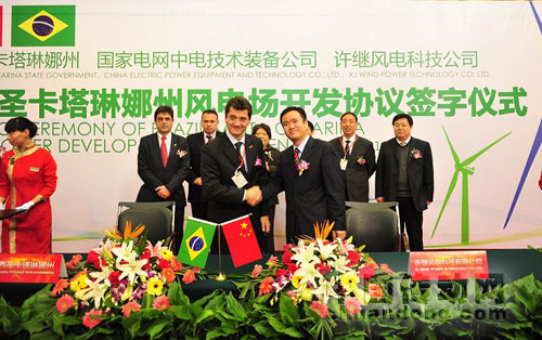 12月10日,由河南省發改委牽頭,巴西圣卡塔林娜州政府和許繼風電科技有限公司關于巴西圣卡塔林娜州戰略合作暨風電場投資開發協議的簽字儀式在許昌迎賓館隆重舉行。