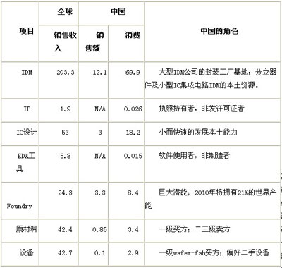 表一,全球集成電路產業價值鏈創造中中國的位置(2007)(單位:十億美元)