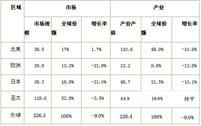表二,全球半導體區域市場需求規模與產值創造比較表(2009)(單位:十億美元)