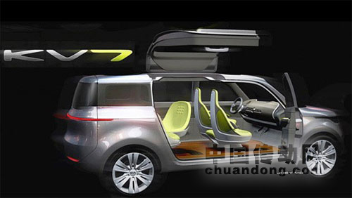 形如紙盒的這款汽車的獨特之處在于,駕駛席所在的前排座椅的車門采用側(cè)開方式,而后座車門則是向上開,上下車非常方便。這款汽車最大程度體現(xiàn)了實用性和便利性,例如,后排座椅可以前后旋轉(zhuǎn)等。起亞汽車公司方面表示:“KV7的風(fēng)格和明年在韓國市場上推出的起亞輕型CUV非常類似。”