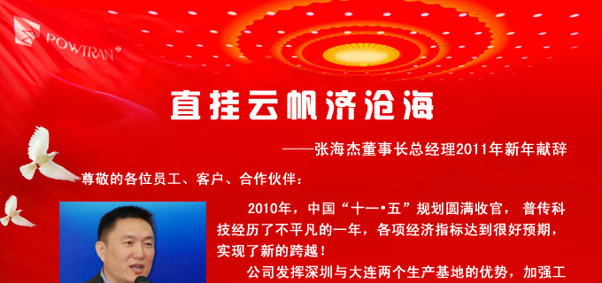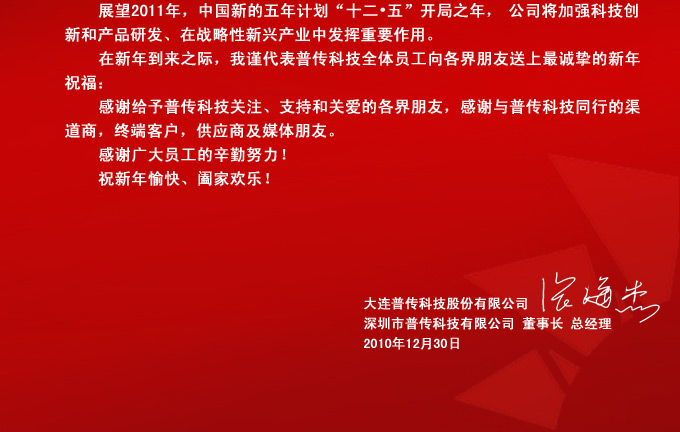 在新的一年到來之際,公司董事長兼總經理張海杰先生回顧了過去的一年取得的不平凡的業績,代表普傳科技全體員工向給予普傳科技關注、支持和關愛的各界朋友及與普傳科技同行的渠道商,終端客戶,供應商及媒體等各界朋友送上最誠摯的新年祝福: