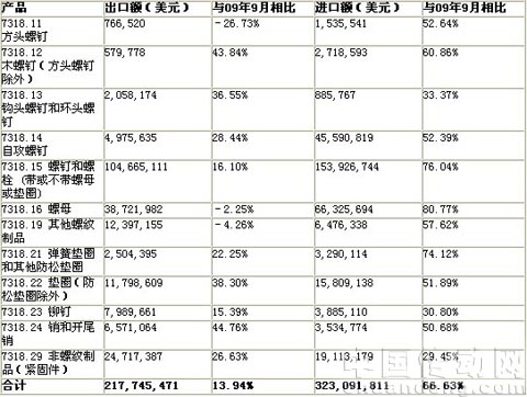 2010年9月美國緊固件進出口值持續增長,與2009年同期相比分別增長66.63%和13.94%。