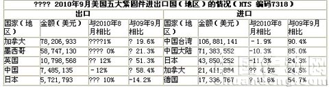 2010年9月美國鋼制或鐵制緊固件進出口貿易情況