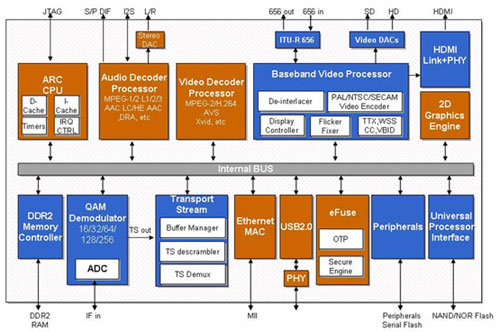 值得一提的是,該芯片創新地將HDMI功能集成到標清芯片中,使得視頻信號可通過HDMI高清數字接口輸出至平板電視機。在平板電視機越來越普及的今天,即使是標清機頂盒,也可以為用戶帶來高清的視覺享受。