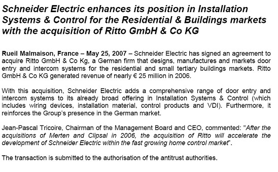 導(dǎo)語:施耐德電氣收購Ritto GmbH & Co KG公司