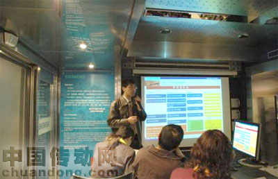 交流的平臺——客戶西門子工程師進行交流[/ALIGN] 西門子過程自動化巡展車長17米,寬7.5米,高4米,車身為明快的藍色 。車廂內(nèi)安裝了完整的SIMATIC PCS 7系統(tǒng),包括4臺控制器站,有冗余型和故障安全型CPU,6臺工程師/操作員站和3臺服務器的系統(tǒng)結(jié)構(gòu)。整個系統(tǒng)集成了PROFIBUS DP/PA現(xiàn)場總線、過程安全、智能現(xiàn)場設備等當今最先進的技術(shù)。同時也集合了西門子過程自動化產(chǎn)品與系統(tǒng)在不同過程工業(yè)中的經(jīng)驗, 如石油、化工、電力、冶金、制藥、水泥、玻璃、環(huán)保等行業(yè)。 西門子過程自動化巡展車作為一個流動的演示平臺,也是個流動的教室,帶著我們的設備,和工程技術(shù)人員去走訪最終用戶、設計院、系統(tǒng)集成商,并將與他們在技術(shù)方面以及工程應用方面展開積極的交流。西門子過程自動化巡展車將繼續(xù)在全國巡回展出,將最前沿的自動化系統(tǒng)和最先進的自動化技術(shù)送到最終用戶、系統(tǒng)集中商和潛在客戶面前,讓他們同西門子過程自動化的專家和技術(shù)人員進行最直接的互動交流。通過與客戶的交流,我們使客戶認識、了解并且接受了我們的產(chǎn)品,同時我們也了解了客戶的實際需求以及對我們產(chǎn)品提出的建議,為我們今后的發(fā)展提出了更加明確的方向,使我們的產(chǎn)品能夠做到更好。