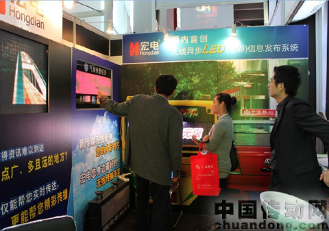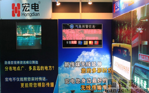 宏電公司從事無線LED信息發布已經有好幾年的時間,素以專業著稱,特別是其3G傳輸技術,更是業界首屈一指。這次帶來了無線LED氣象信息發布系統、無線LED出租車發布系統、無線LED公交車發布系統和全國首創的無線LED異步(全彩)信息發布系統,各種特殊定制的應用LED屏通過鑲嵌式與背景墻結合,讓所有參展客戶對系統應用一目了然,對無線發布這種方式有更直觀的了解。