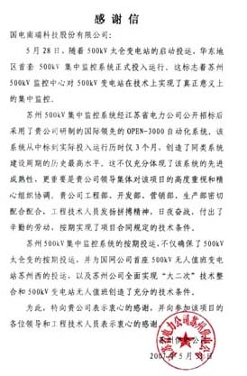 導語:華東首套500kV集中監控系統投運 江蘇蘇州供電公司致國電南瑞感謝信