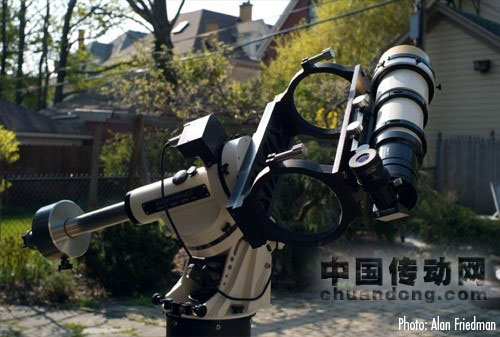通過用流相機拍攝,Friedman能夠在一些簡陋的拍攝條件下,錄制一些簡要的清晰瞬間。使用傳統的相機不大可能撲捉到這些圖像。他的拍攝技術包括了掃描捕捉到的視頻,用手動和軟件的方式選取細膩的圖像,然后將他們融合在一起,制造出一個總結性的圖片。這張圖片從原始的數據中僅選取最好的信息。配置有索尼1/1.8" CCD的Scorpion IEEE 1394黑白相機,可以以15FPS的幀速拍攝1600x1200的圖片,同時提供比DMK相機大20倍的動態范圍。這可以使相機錄制太陽色球層的表面結構,同時在同樣的曝光度下提供更加朦朧的太陽邊緣突出部分。設置感興趣區域的功能更是可以使在滿狀態下相機的下載速度達到最大化。