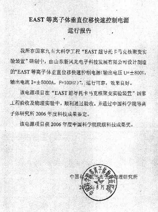 導語:山東新風光公司為國家九五大科學工程“EAST超導托克馬克核聚變實驗裝置”提供了特種電源