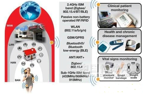 近年來,隨著藍牙®低功耗 (BLE) 和 ANT™ 等低功耗無線技術在智能電話和一些單模外圍設備的廣泛采用,一個使廣大護理人員和醫生們能夠無線地連接醫療保健監控系統的生態系統便應運而生了。一些家庭保健設備可能是移動式的(例如:活動監視器等),而其他一些保健設備則通常會固定安放在家里的某個地方(例如:體重秤等),可能無法連接無線網關。由于人們常常在家里四處走動,因此如手表或首飾等可穿戴式設備可以自動將來自遠處重量秤的緩沖數據傳輸到家中另一處的網關。
