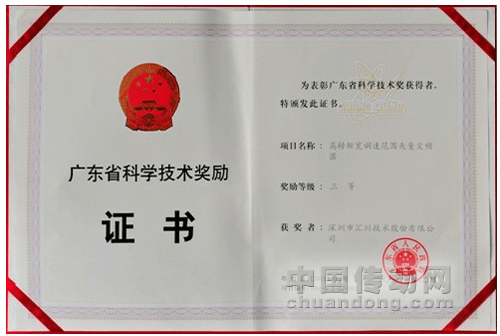熱烈祝賀深圳市匯川技術股份有限公司“高轉矩寬調速范圍矢量變頻器”2011年1月獲得廣東省科學技術獎勵三等獎。