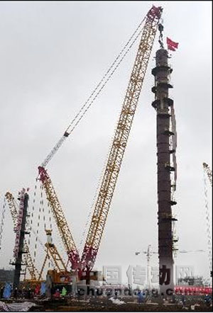 6月28日,2000噸級的履帶起重機在武漢起吊高78.168米,重約400噸的丁二烯第一萃取塔C-101。