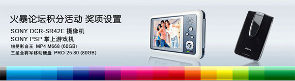 獎品:索尼 SONY 數碼攝影機、索尼PSP掌上游戲機、紐曼 MP4、三星金將軍移動硬盤、紀念T恤衫、精品多功能小刀。[參與活動] [活動介紹]