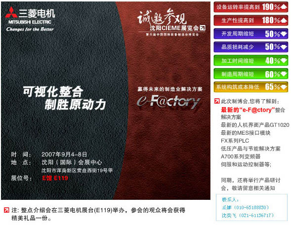 導語:三菱電機自動化(上海)有限公司將與2007年9月4日——8日參加第六屆中國國際裝備制造業博覽會。