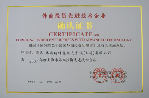 熱烈祝賀路斯特獲評2007年度上海市外商投資先進技術企業