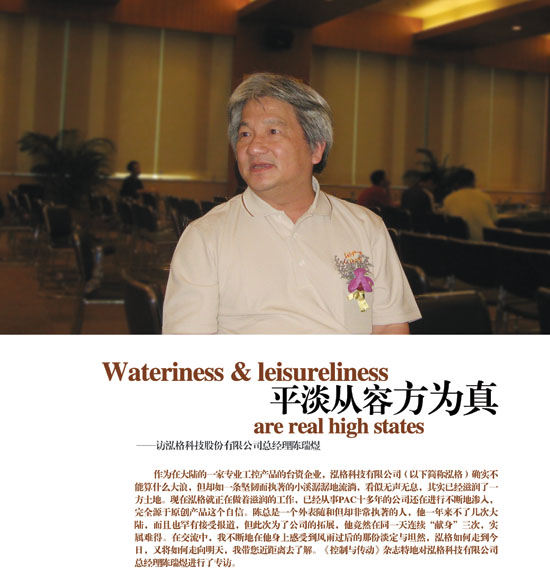 通過與陳總的談話,在我的感覺中他是一個很率性的人,盡管二十多年的創業之路,從順利到坎坷,再到今天的穩定,起起伏伏,他的個性已經被磨去了不少。陳總說最困難的時候也曾經到處“調頭寸”(籌錢周轉),但他一直都在知道如何踏實地去走自己的路,不去受外界影響。他說他喜歡毛澤東,一個并不會帶兵打仗的人之所以會成功,是因為他有自己的一套獨特的方式方法,這是別人學不來的。所以陳總認為泓格走到今天,能有這么多的客戶接受,其中最重要一點就是“原創性”,有自己的主張。