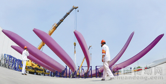 昨日,連云港中復連眾公司風電葉片堆場上的工人們正在吊裝葉片準備外運出口土耳其。