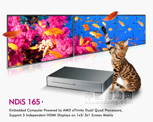 NDiS 165采用AMD A70M控制集線器,并結(jié)合AMD寬域技術(shù),可支持3個(gè)HDMI顯示。該數(shù)字標(biāo)牌播放器不僅能將圖形通過(guò)3個(gè)顯示窗口排成一行,可創(chuàng)建與原物大小相同的數(shù)字海報(bào);也可以擴(kuò)展顯示區(qū)域,盡可能提供更多信息。