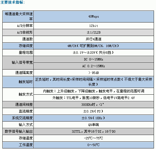 采集卡設計了獨立的時間基準和時鐘控制器,系統內的多個采集卡可以不同的采樣頻率工作。通過軟件設置將系統觸發線和時鐘線級聯起來,采集系統在統一的時鐘和觸發控制下實現全同步采集。A/D轉換的最高采樣頻率為40MHz,按1、2、5分頻實現18檔采樣率設置;四個通道可獨立地用軟件控制增益,從±100mV到±20V按1、2、5分為8檔。每通道最大采樣深度可達到16Msa。通過特殊設計的環形緩沖器實現預觸發存儲功能,特別適合工程上的單次過程信號記錄。預觸發和觸發后的延時可以達到最大采集長度。