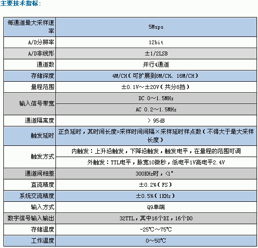 采集卡設計了獨立的時間基準和時鐘控制器,系統內的多個采集卡可以不同的采樣頻率工作。通過軟件設置將系統觸發線和時鐘線級聯起來,采集系統在統一的時鐘和觸發控制下實現全同步采集。A/D轉換的最高采樣頻率為5Msps,按1、2、5分頻實現18檔采樣率設置;四個通道可獨立地用軟件控制增益,從±100mV到±20V按1、2、5分為8檔。每通道最大采樣深度可達到16Msa。通過特殊設計的環形緩沖器實現預觸發存儲功能,特別適合工程上的單次過程信號記錄。預觸發和觸發后的延時可以達到最大采集長度。