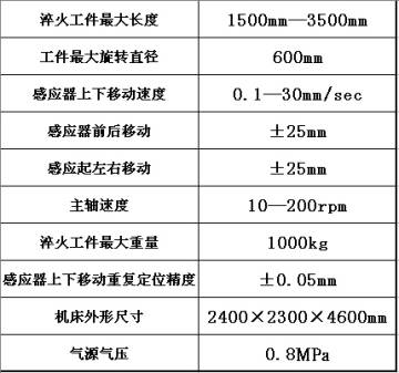 中頻淬火機床是我公司成套感應加熱設備之一。全機械傳動,設計新穎、結構美觀、功能齊全,適合與本公司超音頻、中頻加熱電源裝置配套使用,本機床可根據用戶要求提供PLC或CNC控制系統。機械部分采用滾珠絲桿傳動,具有可重復定位、精度高、自動化程度高、程序容量大和高可靠性能等特點。操作簡單、使用方便、使用壽命長,是一種用途廣泛、性能優越的多功能感應淬火設。 技術參數表如下圖: