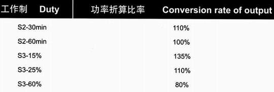電機的基準工作制為斷續周期工作制S3,負載持續率為40%。其它工作制可按表1對技術數據表中的功率進行折算。