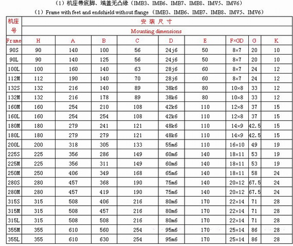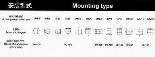 電機的基本安裝型式為IMB3、IMB5、IMB35,并可在這三種基本安裝型式的基礎上派生其它安裝型式。IMB5及其派生型式,IMB3、IMB35的派生型式,其機座號范圍有所限制,具體在訂貨時商議。