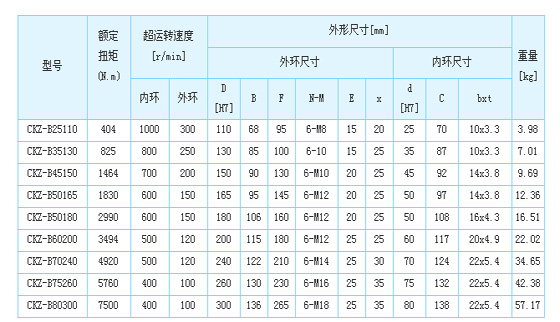 CKZ-B型號為有軸承支撐的楔塊式離合器,不含任何油封,安裝時須提供潤滑油脂及油封,標準潤滑方式 為脂潤滑。
