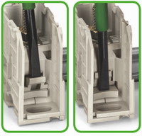 WAGO不僅生產使用籠式彈簧夾持單元的接線端子,還提供螺栓連接,適于35mm2、70mm2、120mm2、185mm2以及300mm2導線的軌裝接線端子。可安裝在TS 35型導軌上或直接進行底板安裝(帶有適于底板安裝的長孔)。采用側面進線的方式,便于操作。每個端子需安裝兩個端子罩蓋,從而進行防觸電保護。跨接用連接板有2極和3極兩種類型。接線端子組成端子排時,可通過緊固件及M3螺母提升牢靠程度。而一般情況下,在導軌上安裝時,使用端子側面的連接銷即可滿足要求。