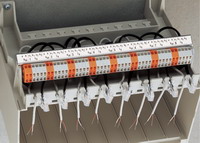 正面進線小型端子和端子排適用導線截面積0.08-2.5mm2,額定電壓800V。具有籠式彈簧接線單元,每個電位最多可連接4根導線。在底板安裝方面可選擇帶固定銷釘的或帶固定耳的。