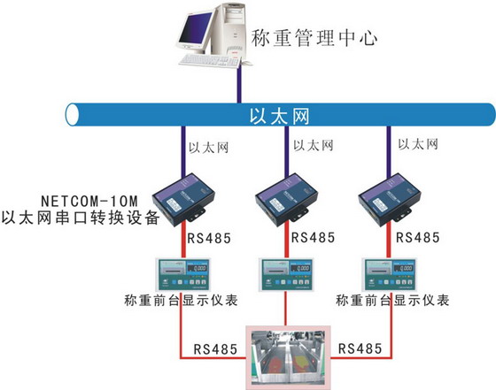 如圖所示,機場行李管理中的稱重節點是一個串口設備,完成前端的數據采集和處理, NETCOM-10M 則把稱重節點接入以太網網絡,在以太網和稱重節點之間建立一個透明通道,這樣局域網內的監控管理端和數據服務器通過機場現有的以太網網絡完成與稱重系統之間的通信。