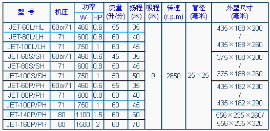 JETS/JETL/JETP 系列射流泵系列射流泵是高效噴氣水泵,具有極強的噴射力甚至有氣霧出現(xiàn),它由單個葉輪,導葉輪和一個射流管組成,這套水泵特別適合于家居用水供應和小規(guī)模的農(nóng)業(yè)用水。