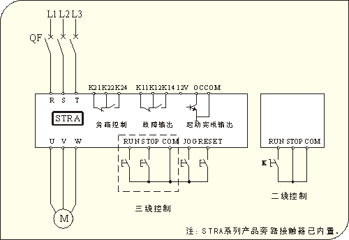 STRA系列電動機軟起動器(見下圖白框內)的特點是將軟起動單元及旁路接觸器同時裝在一個壁掛式的機殼內,當被控電動機起動完成后,自動將電機通過旁路接觸器投入電網運行,其主電路有R.S.T.(接三相交流電源)和U.V.W(接三相交流電機)六個接線端,接線后即可使用。特別對配電室空間小或機旁操作,掛在墻上通過操作鍵盤就可以控制電機的起動、停止。STRA系列軟起動器還預留有外部起動、停止、故障復位等接口,可方便地實現遠程監控。其接線原理圖詳見下圖。STRA系列軟起動器內置電子熱過載保護器,使用時不需另加電機保護元件。