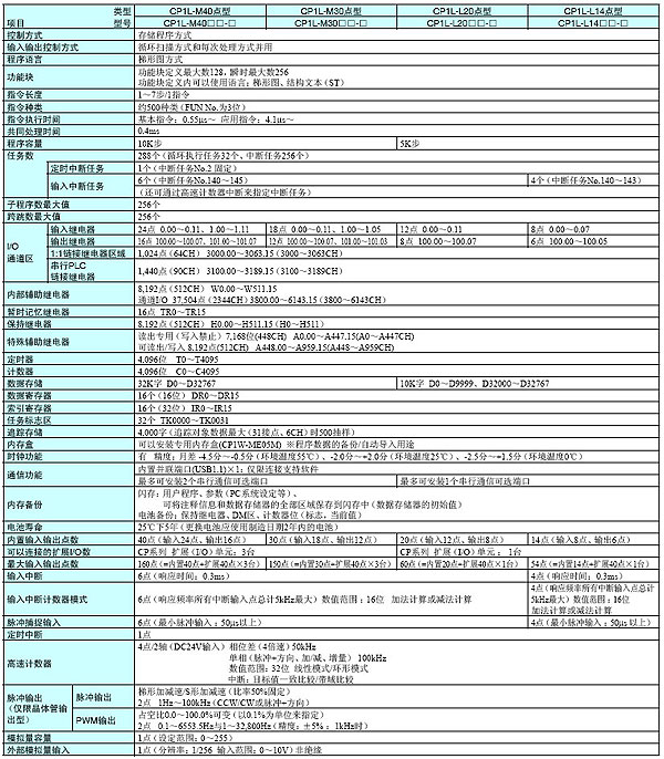 CP1L本體有14點、20點、30點和40點四種規格,可根據不同需求進行選擇,其開關量的擴展也達到了最多160點;程序容量最大10k步,數據容量最大為32k字。即使是14點的小點數CPU上也內置有USB端口,從簡單的順序控制,到脈沖功能和串行端口等應用功能,都是和CP1H一脈相承。CP1L的CPU單元搭載了2軸100kHz的脈沖輸出功能,可在高精度定位上發揮無窮威力;搭載的4軸100kHz(單相)或2軸50kHz(相位差)的高速計數器功能則在紡織機械等主軸控制和建材制造機械、石材切割機等搬運定位上大有用武之地;CP1L還突破性地加入了變頻器定位功能,今后無須計算變頻器的減速位置,也可對變頻器進行快速、簡單的定位操作!