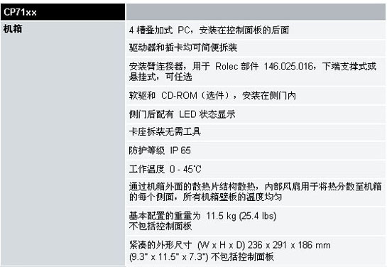 面板型 PC CP71xx 系列適于安裝臂安裝。控制面板安裝在面板型 PC 的前部,因此可為各種應用配置合適尺寸的顯示器和鍵盤。若裝有運行在 Windows 2000 或 Windows XP 下的 TwinCAT 等自動化軟件,CP71xx 面板型工業 PC 則可為機械制造和工廠自動化應用提供一個功能強大的平臺。
