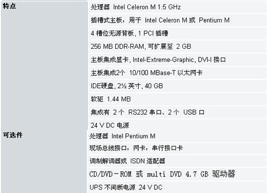 可安裝一臺高性能 PC 的所有組件,包括 Intel Pentium M 。在側門內除了軟驅之外,還可安裝一個 CD/DVD-ROM 或 multi DVD 4.7 GB 驅動器。通過外壁板上的散熱片散熱。封閉機箱內的風扇可保證散熱均勻。機箱也可安裝在安裝臂上,可選擇下支撐或懸掛式。采用下面支撐的底座可安裝固定緊湊型 PC。無需從安裝臂上拆下來,即可方便地打開機箱,以對所有集成組件進行快速維修或擴展。其專門設計的散熱結構可保證安全運行,工作溫度可達 45℃。