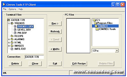 使用 CIMREX FTP Client 程序和 CIMREX Tools File Transfer 程序,可將配方檔案從 EXTER 或 CIMREX 操作員人機傳輸至 PC 進行備份或編輯 (直接在程序中或另外以 Excel 進行編輯)。 之后,可將新的配方載入回操作員人機。 此外,也可以很輕松的將趨勢檔案從操作員人機收集到計算機上,并以不同類型的程序使用這些趨勢檔案。 列出所有傳入警報的警報清單也可以傳輸至計算機。