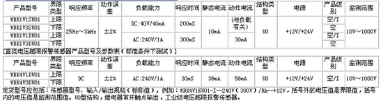 交流電壓越限報警傳感器產(chǎn)品型號及參數(shù)表(標(biāo)準(zhǔn)條件下測試)