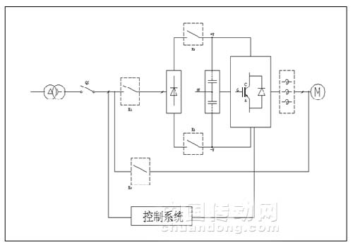 三相交流電由三相橋式整流器整流為直流電,電容器濾波后由逆變器逆變?yōu)殡妷骸㈩l率可調(diào)的三相交流電,經(jīng)濾波后供電機(jī)調(diào)速用。