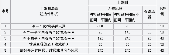 1. 安裝檢測桿的測量段應是直的,其上下游直管段長度參照下表所規(guī)定的長度。