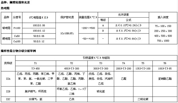 防爆標志:分為dIIBT4、iaIIct4T和dIICT6、iaIICT6適用于II級以下,溫度組別分別為T4、T1~T6以上,含爆炸性氣體場合的溫度測量。